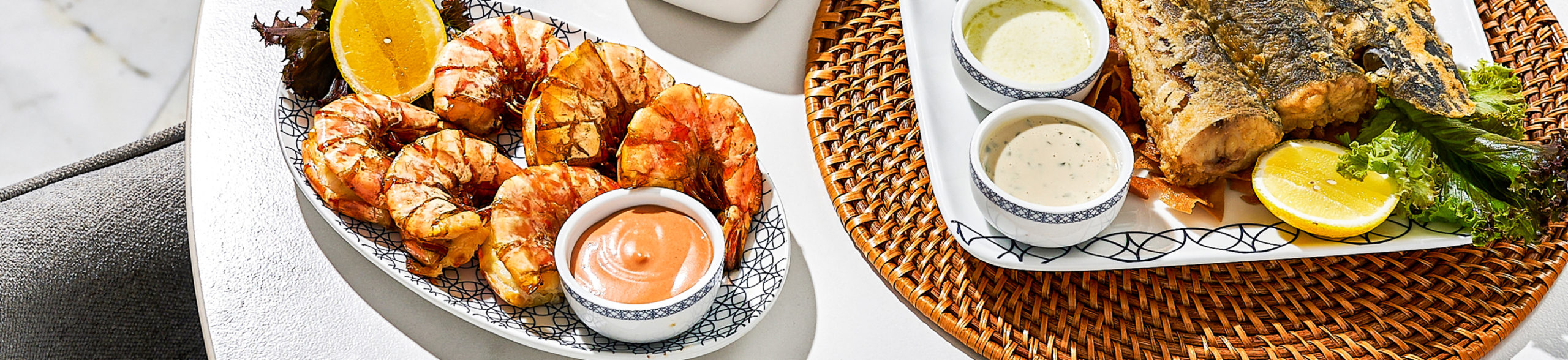 | Shrimp Provencale | روبيان بروفنسال | Grilled shrimp sautéed with garlic lemon& coriander | روبيان مشوي مع صوص الليمون بالثوم والكزبرة | 52 درهم إماراتي |